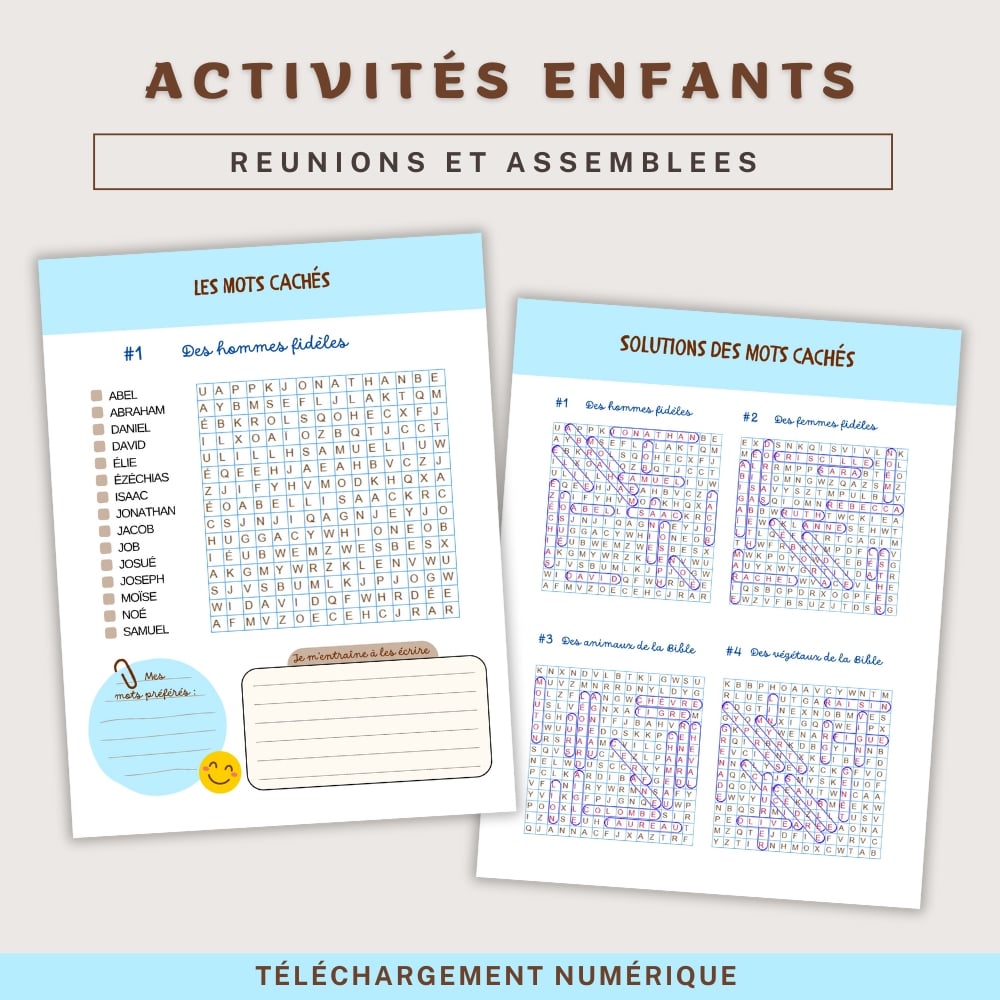 Chaque grille est accompagnée de ses solutions, facilitant ainsi l’usage pour les parents et enseignants souhaitant enrichir les activités enfants avec un contenu stimulant et bibliquement pertinent.